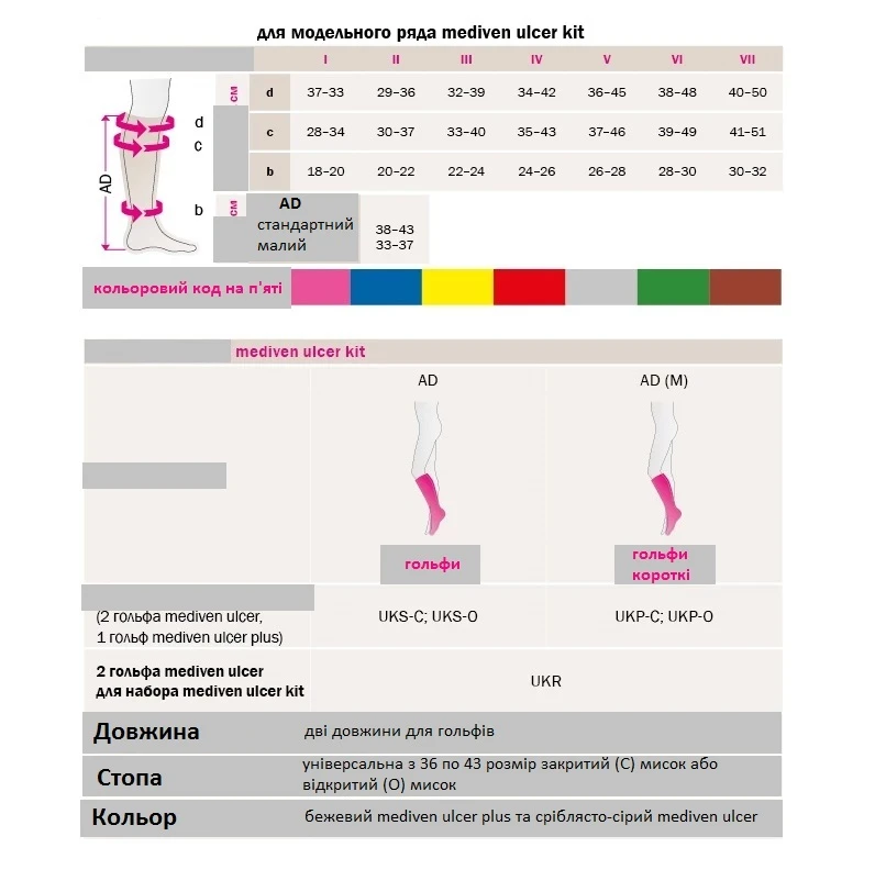У набір входять два види компресійних гольфів: 2 гольфи mediven ulcer + 1 гольф mediven ulcer plus.