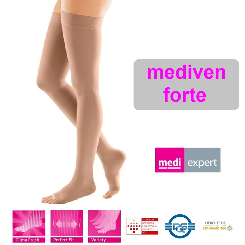 Компрессионные чулки Mediven Forte с резинкой без силикона - оптимальное средство для компрессионной терапии венозной патологии нижних конечностей, сопровождающейся трофическими расстройствами и/или отеками.